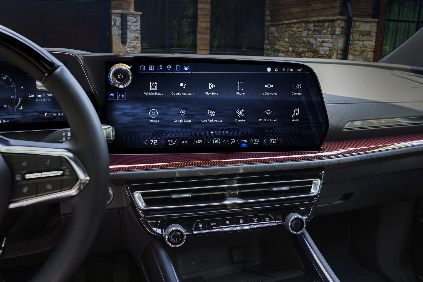 L'écran d'infodivertissement du Traverse mesure 17,7 pouces en diagonale, soit plus du double du plus grand écran de la génération précédente. L'affichage permet la visualisation simultanée de la navigation, des commandes musicales, des réglages de climatisation et des fonctions téléphoniques sans avoir à basculer entre les écrans.